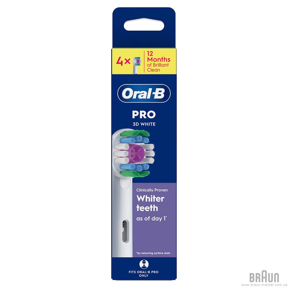 Насадка зубной щетки Oral-B Pro 3D White содержит уникальную полирующую чашечку, которая отбеливает зубы, начиная с первого дня, благодаря устранению пятен с поверхности зубной эмали. переменной насадки: цвет щетинок из зеленого меняется на желтый, напоминая вам, когда нужно заменить насадку для обеспечения 100% эффективности очистки.