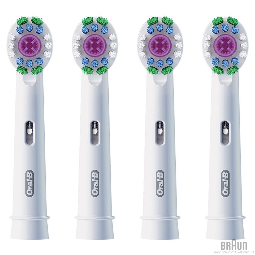 В комплекте 4 сменные насадки Oral-B 3D White Clean Maximiser EB 18 RB (2). Для идеальной белизны зубов.