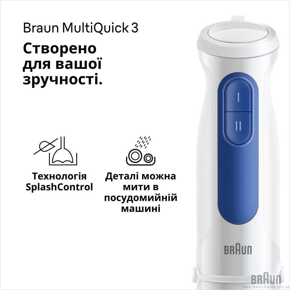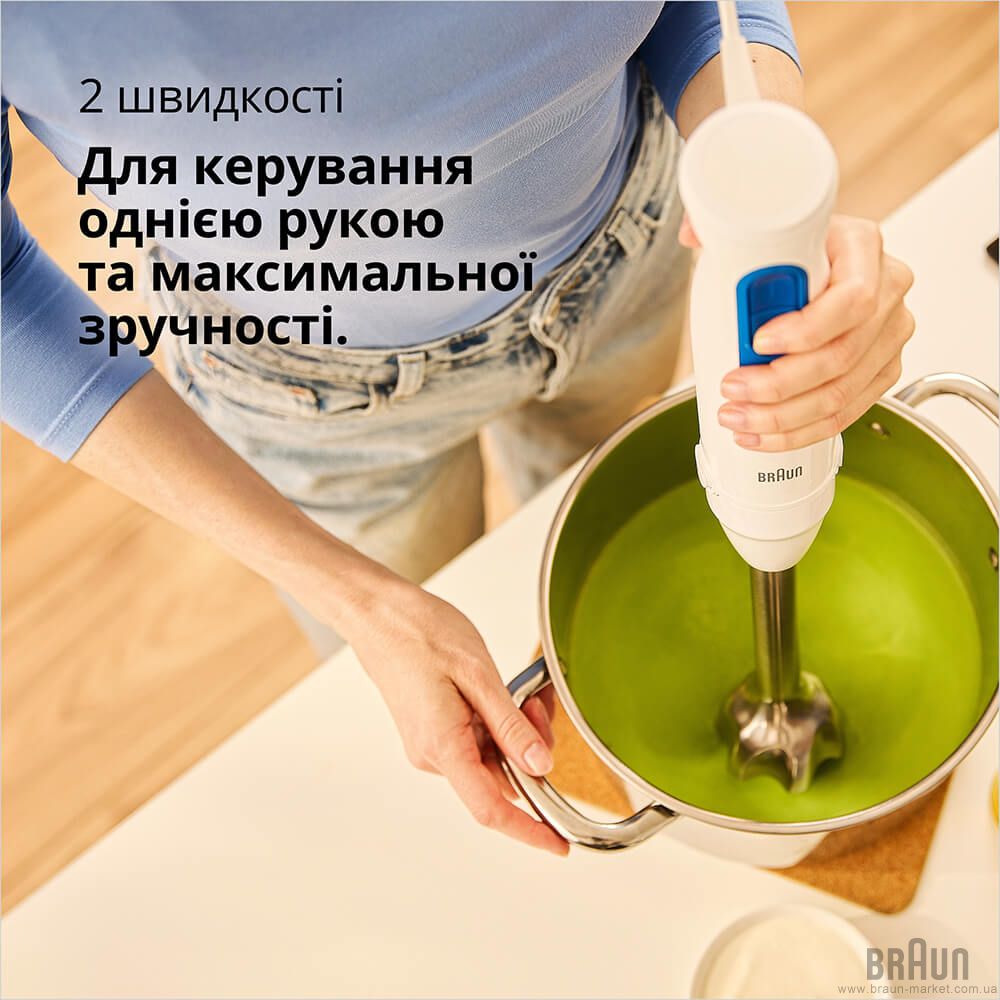 Погружной блендер серии MultiQuick 3. Максимальная мощность моторного блока: 900 Вт. Количество скоростей: 2. Цвет: белый.