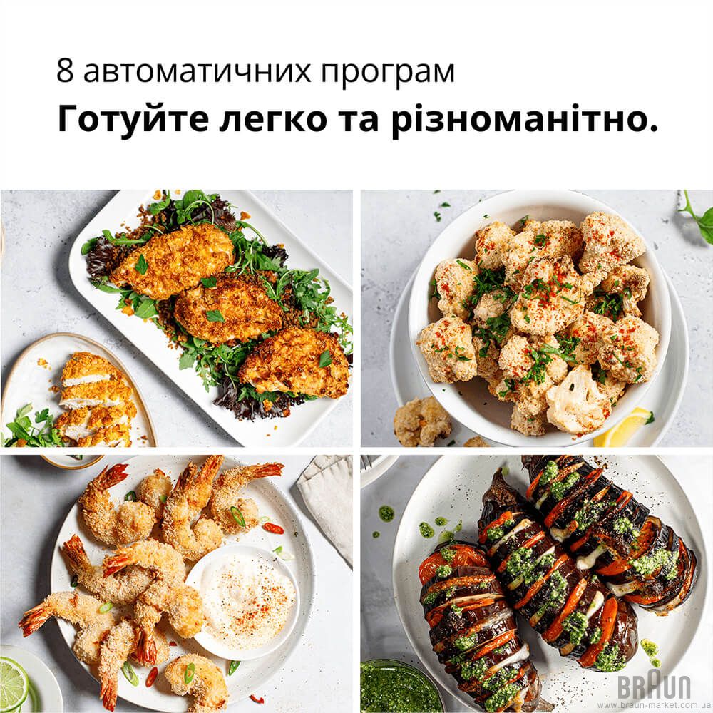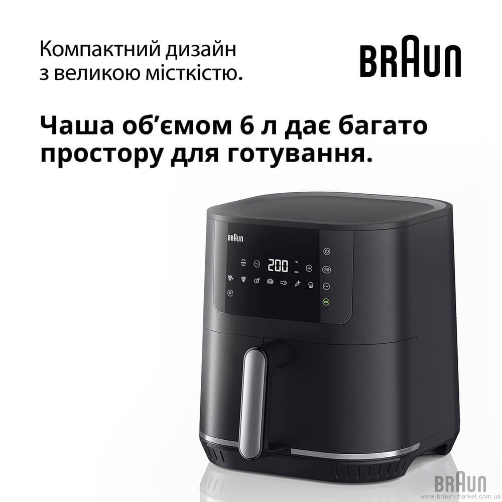 Мультипечь Braun HF 5034 IBK относится к серии MultiFry 5. Мощность: 1700 Вт. Объем чаши с антипригарным керамическим покрытием (PFAS FREE): 6 л. Регулируемый термостат: 80–220 °C. Цифровой таймер. 7 автоматических программ + разогрев. Сенсорное управление. Автоотключение. Технология RealAir. Чашу можно мыть в посудомоечной машине.