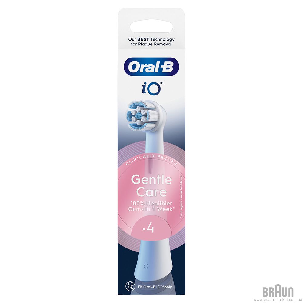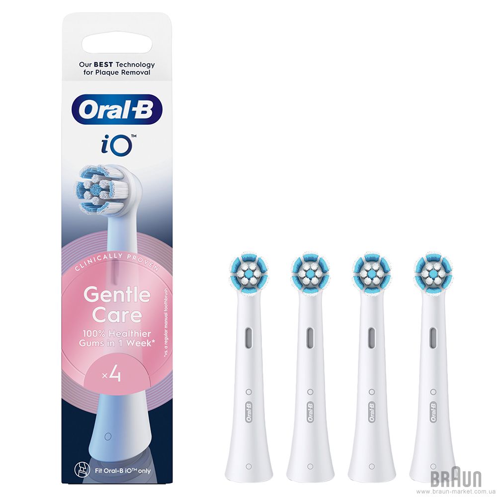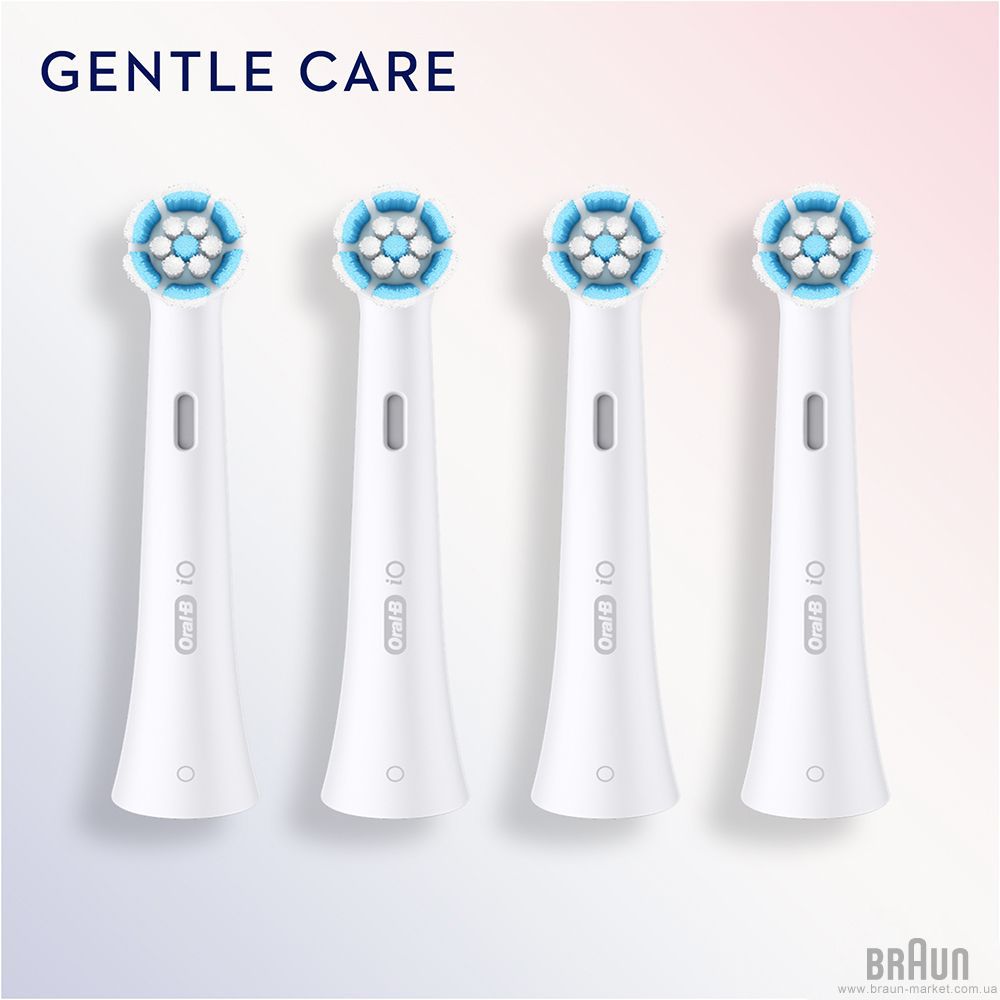 Комплект насадок Braun Oral-B iO Gentle Care RB SWF-4 White (4). Сумісні з усіма зубними щітками Braun Oral-B серії iO. У комплекті 4 насадки. Підходять для щоденного використання з екстра м'якою щетиною для чутливих зубів та ясен.