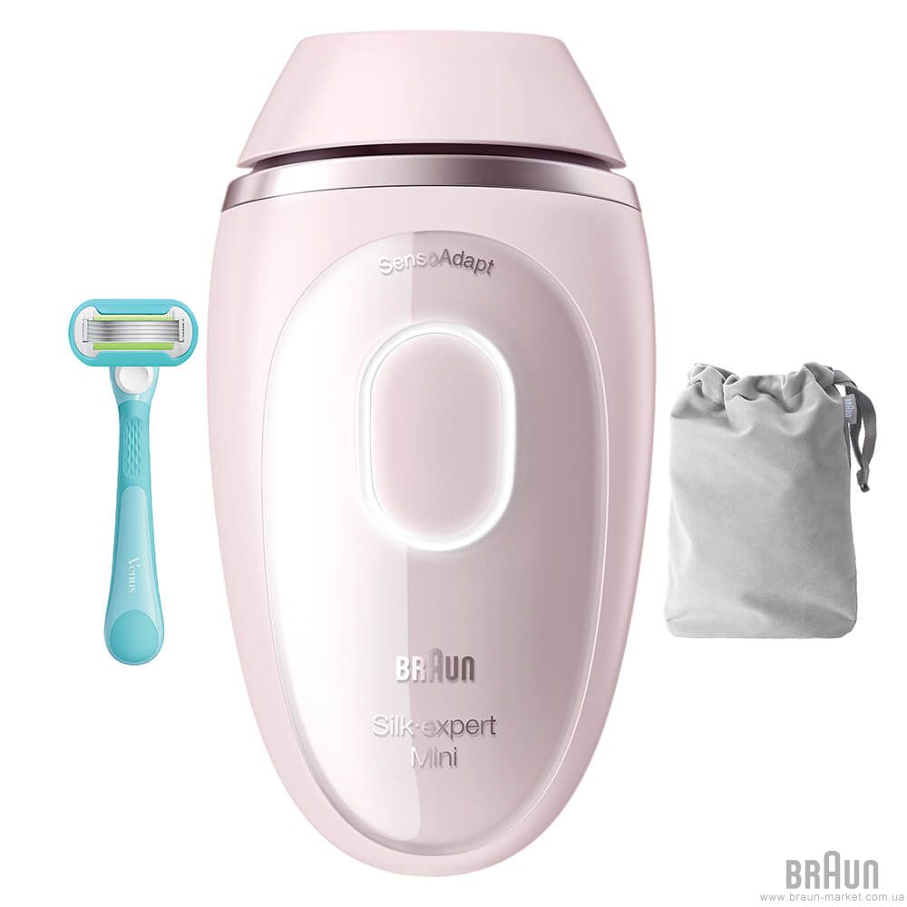 Вміст коробки: Фотоепілятор Braun для видалення волосся, бритва Venus (модель може відрізнятися), косметичка