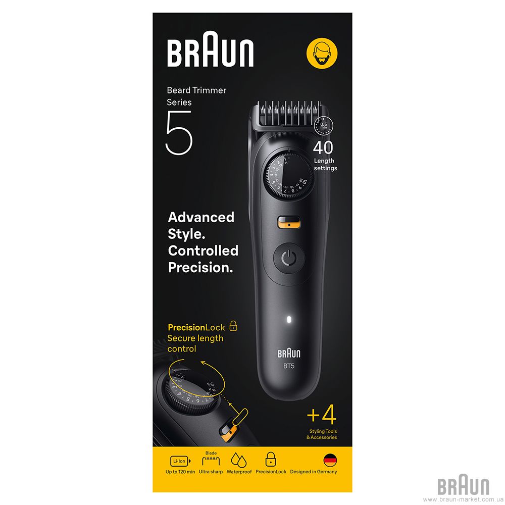 Тример для бороди Braun Series 5 BT 5520. Технологія AutoSense. Функція PrecisionLock. Тример оснащений 40 налаштуваннями довжини з кроком 0,5 мм. Живлення: від Li-Ion акумулятора. Час роботи від акумулятора: 120 хв. Час заряджання: 90 хв. Індикатор низького заряду. Ножі, що самозаточуються, з необмеженим терміном служби. Корпус тримера на 100% водонепроникний. Комплектація: Два регульовані гребені (на 0,5-10 мм і на 10,5-20 мм). Точна насадка для деталізації. Зарядний пристрій адаптується під напругу будь-якої країни світу (в діапазоні 100-240V). Щіточка для чищення.