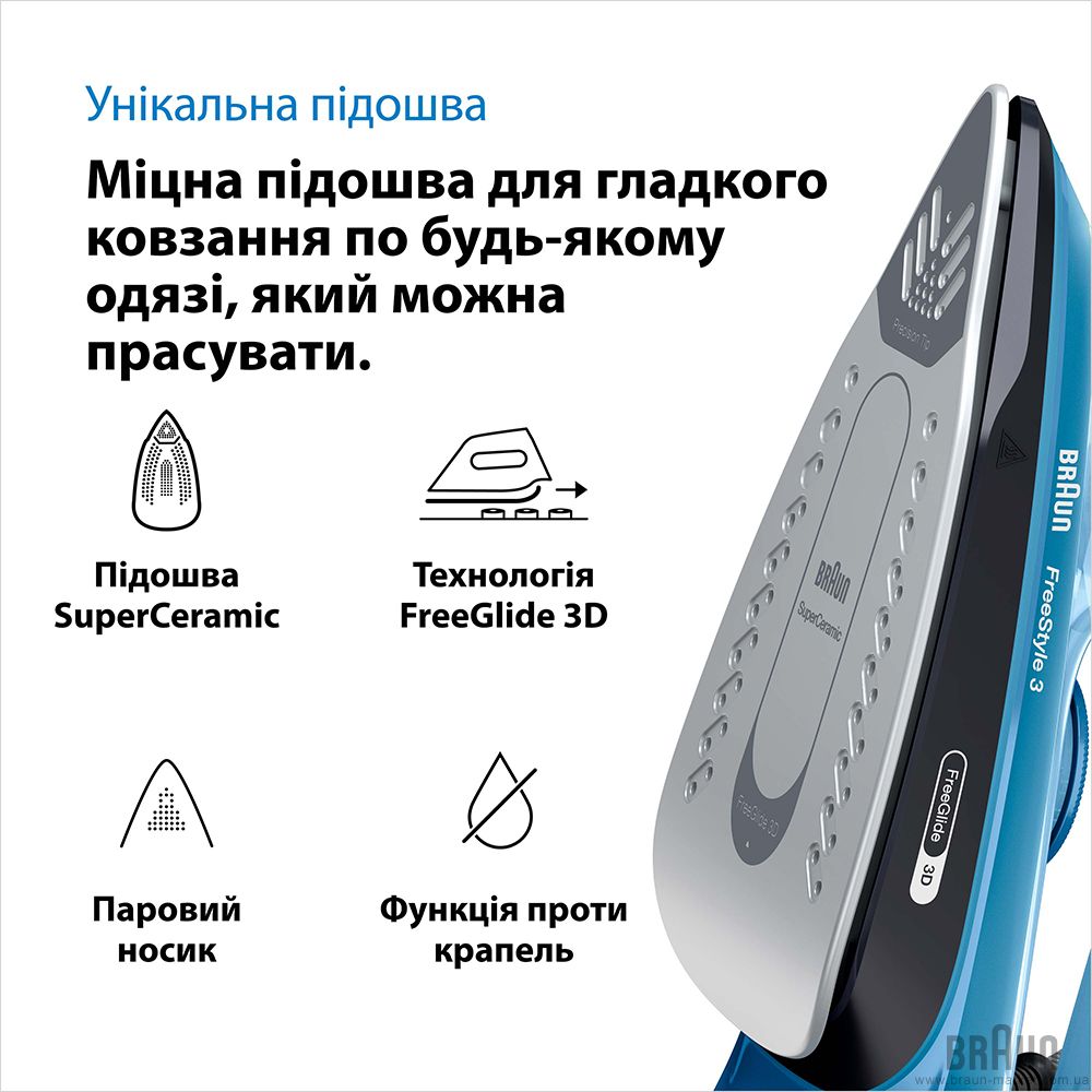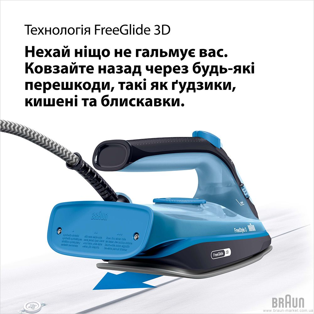Праска Braun FI 3194 BK серії FreeStyle 3. Потужність: 2400 Вт. Інноваційна, закруглена з заднього боку, підошва FreeGlide 3D виготовлена з кераміки SuperCeramic (плавне ковзання на 360 градусів, без зачіпання ґудзиків, кишень і блискавок). Паровий удар: 200 г/хв. Регульована подача пари: 0-45 г/хв. Обсяг резервуара для води: 270 мл. Вертикальне відпарювання. Функція автоматичного відключення. Система антинакип і антикапля. Паровий носик. Колір: синій/чорний.