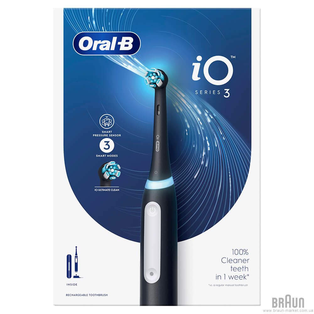 Зубна щітка Oral-B iO Series 3 iOG3.1B6.2K Black. 3D-технологія чищення зубів. Режими чищення: 3 (щоденний, делікатний та відбілюючий). Професійний 2-хвилинний таймер. Кількість насадок: 1. Індикація рівня заряду. Інтелектуальний датчик тиску попереджає про занадто сильний тиск. Дорожній футляр. Вологостійкий корпус. Безконтактне заряджання. Система живлення: акумулятор.